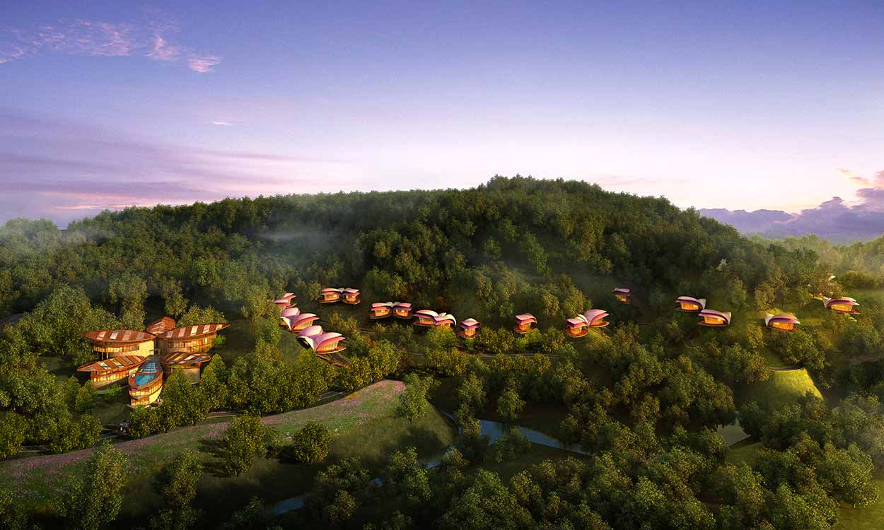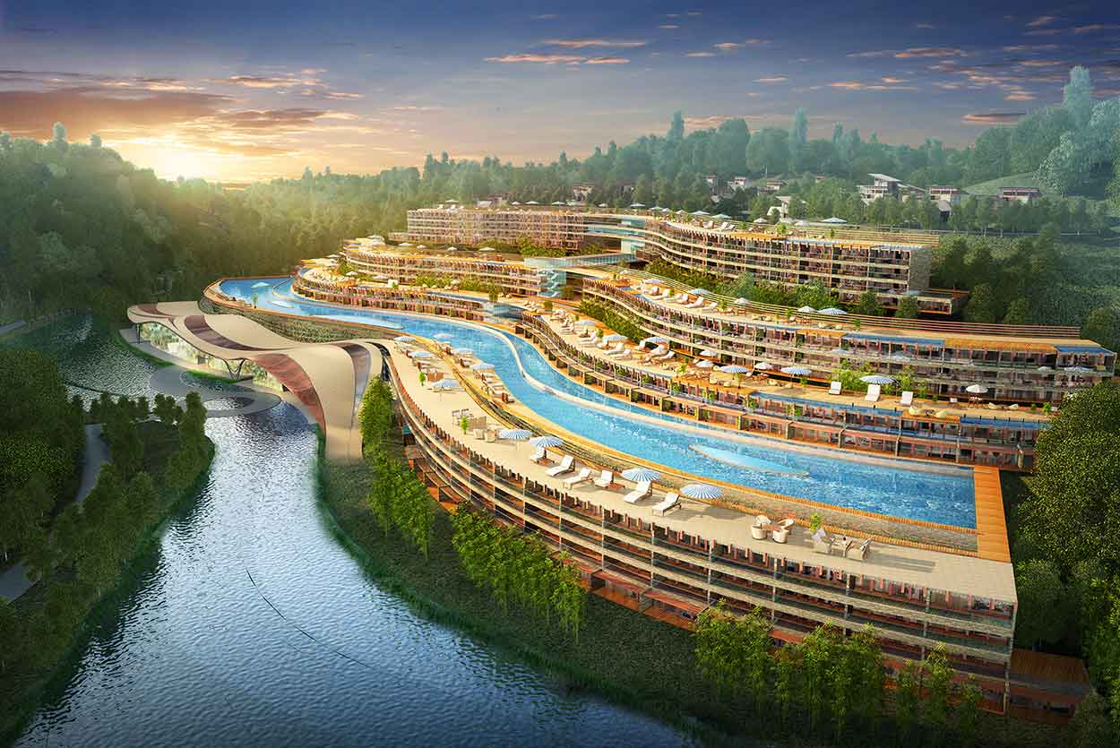 我司为大峡谷设计了游客服务中心、山杜鹃精品酒店、小溪村度假酒店等特色建筑。山杜鹃精品酒店设计取材于山中遍布的杜鹃花,以花瓣数量的变化设计不同房型,浪漫、私密、尊贵、自然。小溪村度假酒店建筑顺应山势,形成错落层叠的客房布局形式,将建筑、山、水融为一体。