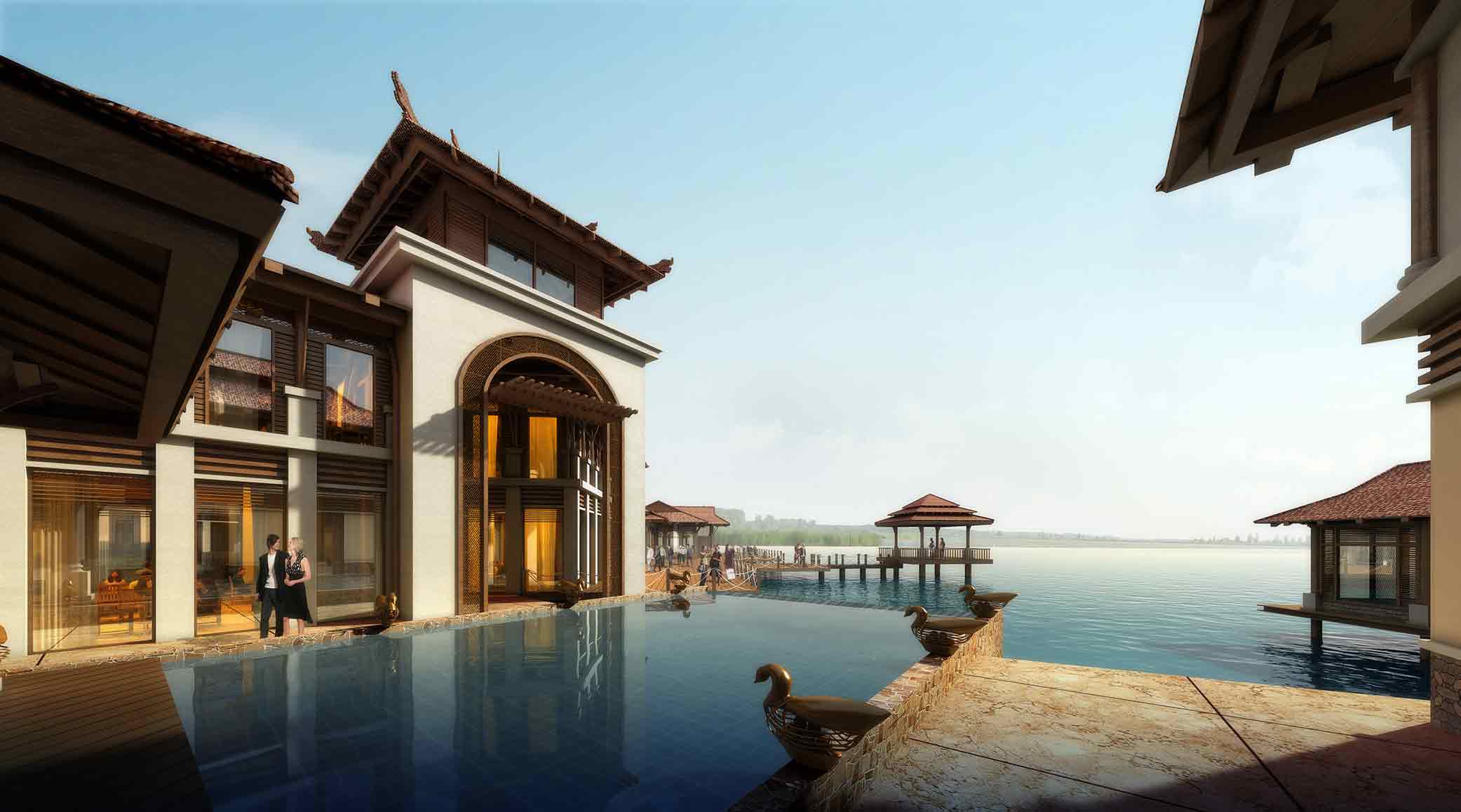 悦湖居精品酒店位于宁波东钱湖北岸,面对周边地区多个五星级酒店竞争,将本项目定位为私密性院落式小型奢侈度假村,走精品化、纯高端发展策略,充分发挥东钱湖景观价值,打造多层水景,建设巴厘岛式临水建筑,以东方禅意为文化主题,创造高端养生体验度假场所。