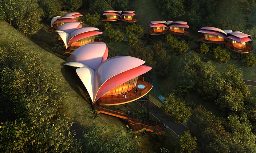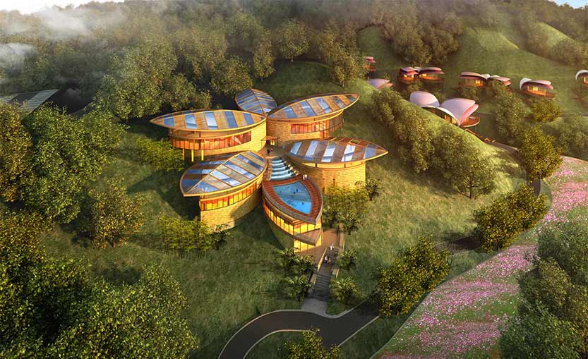 项目酒店和会所位于八乡山大峡谷的山谷之中,可俯瞰粤东大峡谷。设计方案从当地漫山遍野的杜鹃花获取建筑设计源泉,使酒店融于自然,也成为清幽山谷的点缀。
