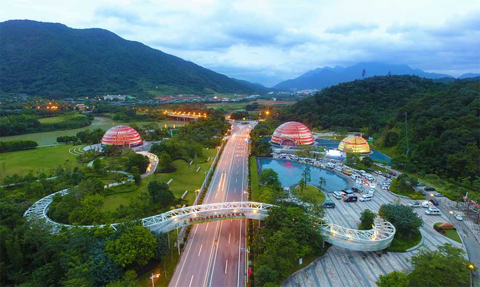 本项目作为整个从化新温泉度假区门户,是未来从化旅游地标之一,承担从化旅游文化展示和传播平台。设计方案以“地方性、现代性、生态性、经营性”为设计理念,提取荔枝、温泉、流溪河三大地方特色元素,将其融入整个广场设计过程。广场由三个球状建筑、温泉广场和人行天桥构成,球状主体建筑分别作为展示中心、接待中心和休闲购物中心。项目建成后已经成为从化地区婚纱摄影、举办跨年乡村音乐节、全国露营大会、全国摄影大赛等活动的定点举办场地。
