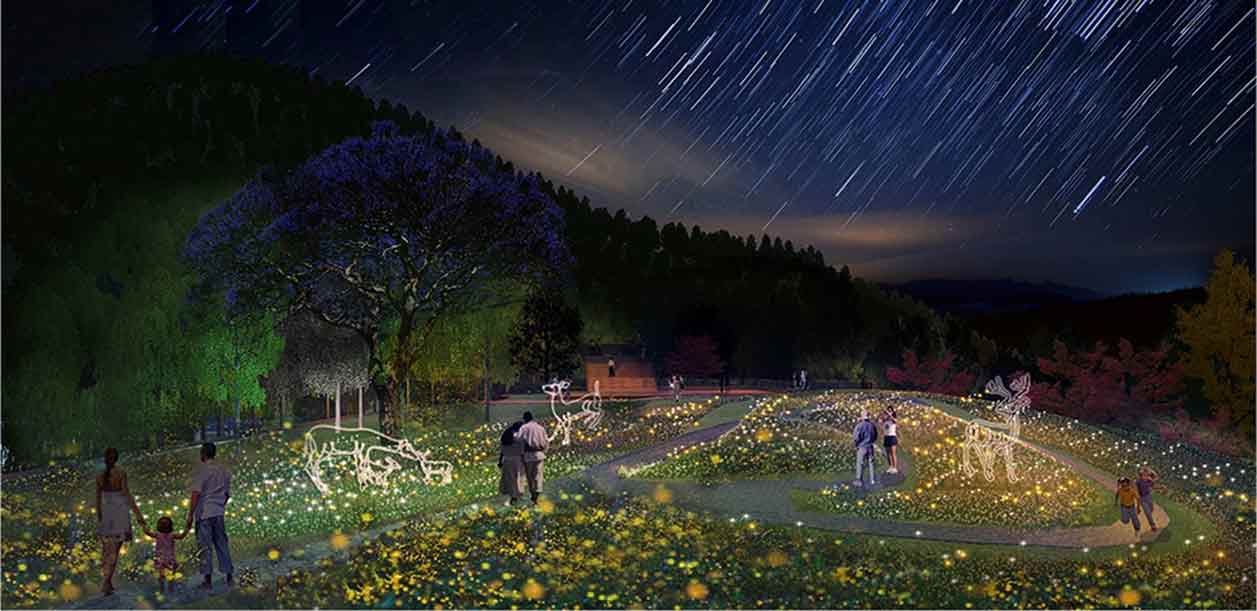本设计依托帽子峰仙境般的环境打造魔法森林,分为仙境迷踪、创意缤纷、动物精灵、奇幻森林四大组团。设计围绕魔幻主题,提炼“森林、竹林、木”等元素,利用植物造景、景观灯光、全息投影等营造魔幻的氛围,让人仿佛置身魔法仙境。游客在森林里可以度假观星、欣赏萤火虫和灯光秀,尽情的感受森林魔幻、炫丽和神秘的场景变化,在欢声笑语中享受森林假期。